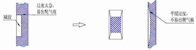 柱子的縮水的改善方式見如圖1、圖2所示:改善前柱子的膠太厚,易縮水;改善后不會縮水。